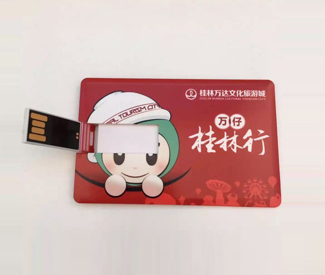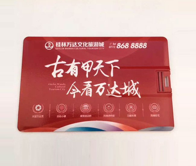桂林萬達文化旅游城定做名片U盤贈品,作為旅游文化宣傳贈品,由深圳卡片U盤廠家制作,卡片U盤采用ABS材料制作,擁有良好的堅硬度,高清彩印旅游主題圖片,更好的得到宣傳效果。卡片禮品U盤裝配進口原裝超薄黑膠體芯片,具有防水,防震,防塵良好性能,正常工作中讀寫速度快,實用性能強。桂林萬達文化旅游城定制這款U盤,不僅擁有精美的外表,又不失廣告宣傳效果是一款值得擁有,值得收藏的U盤禮品。